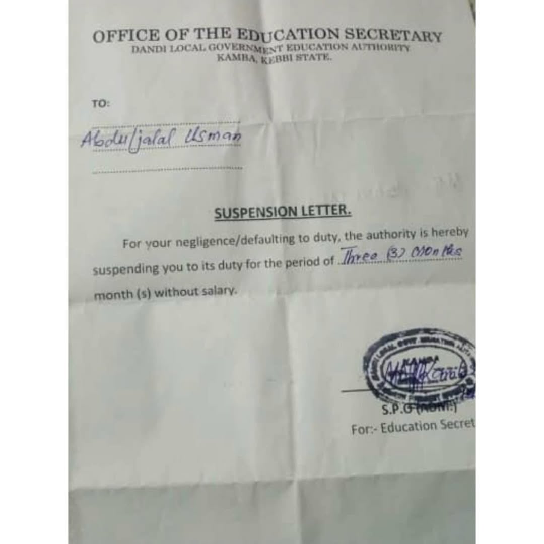 The suspension letter, issued by the Education Secretary of the Dandi Local Government Education Authority (LGEA) in Kamba, officially accused Usman of "negligence and defaulting to duty." However, observers noted with concern that the letter failed to specify any actual professional failures or dates of absence that would typically justify such a severe penalty.